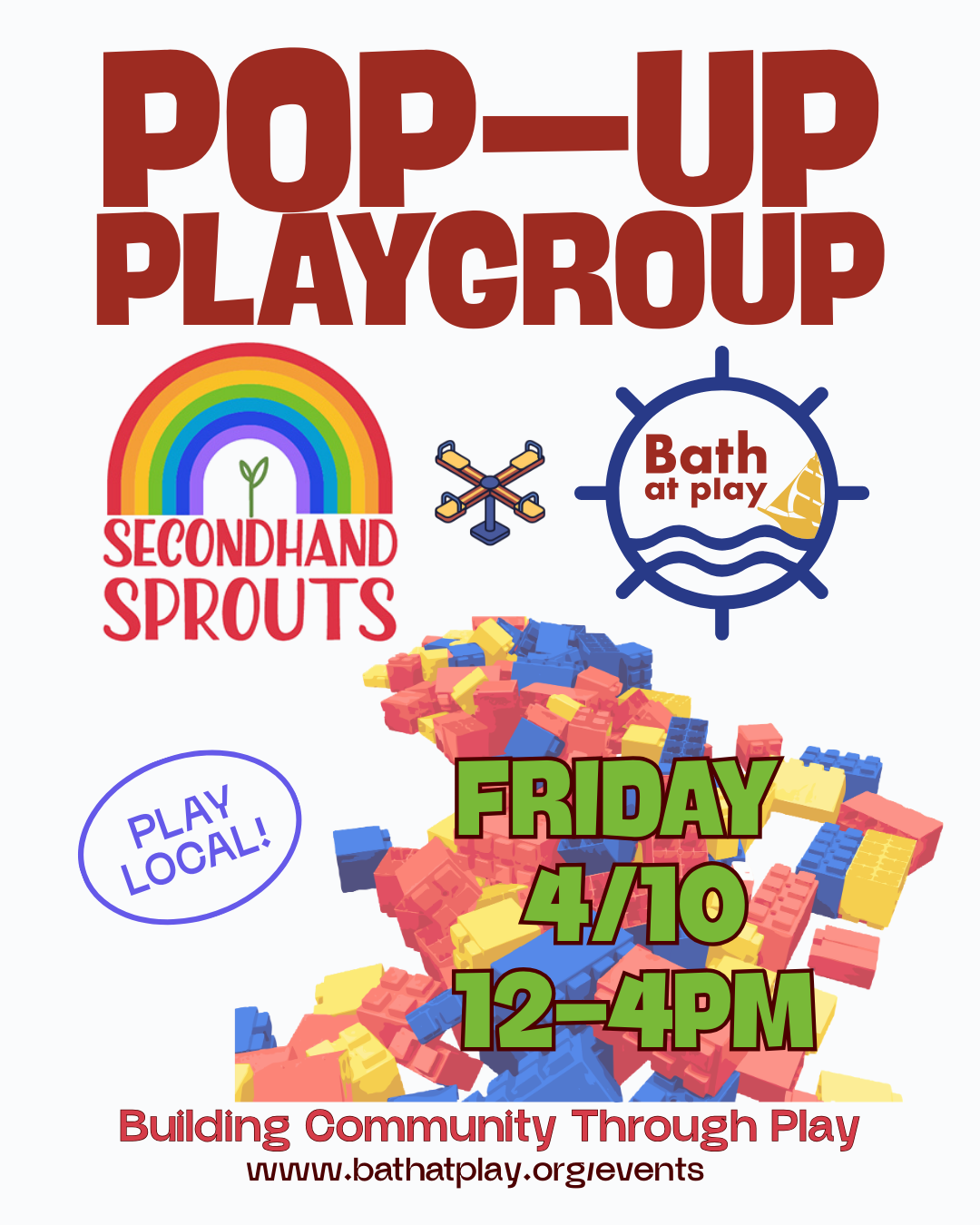 Build Community through Play with Bath at Play and Secondhand Sprouts on Friday, April 10, 2026 from 12PM to 4PM! This is a drop in playgroup at Secondhand Sprouts (99 Commercial Street, Bath) that will feature the Bath at Play Build.Together. supersize building blocks. Snacks will be available while supplies last.