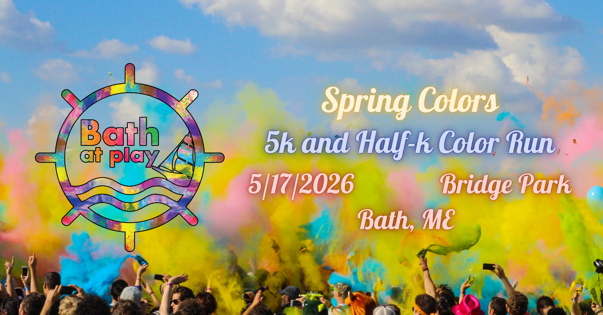 Back to All Events 2026 Spring Colors 5k and Half-k Color Run Sunday, May 17, 2026 8:00 AM 11:00 AM Bridge Park 23 Commercial Street Bath, ME, 04530 United States (map) Google Calendar ICS Join us on Sunday May 17, 2026 in Bridge Park for the second annual Spring Colors 5k and Half-k Color Run! Please visit our event webpage for more information and visit https://springcolors.bathatplay.org to register.